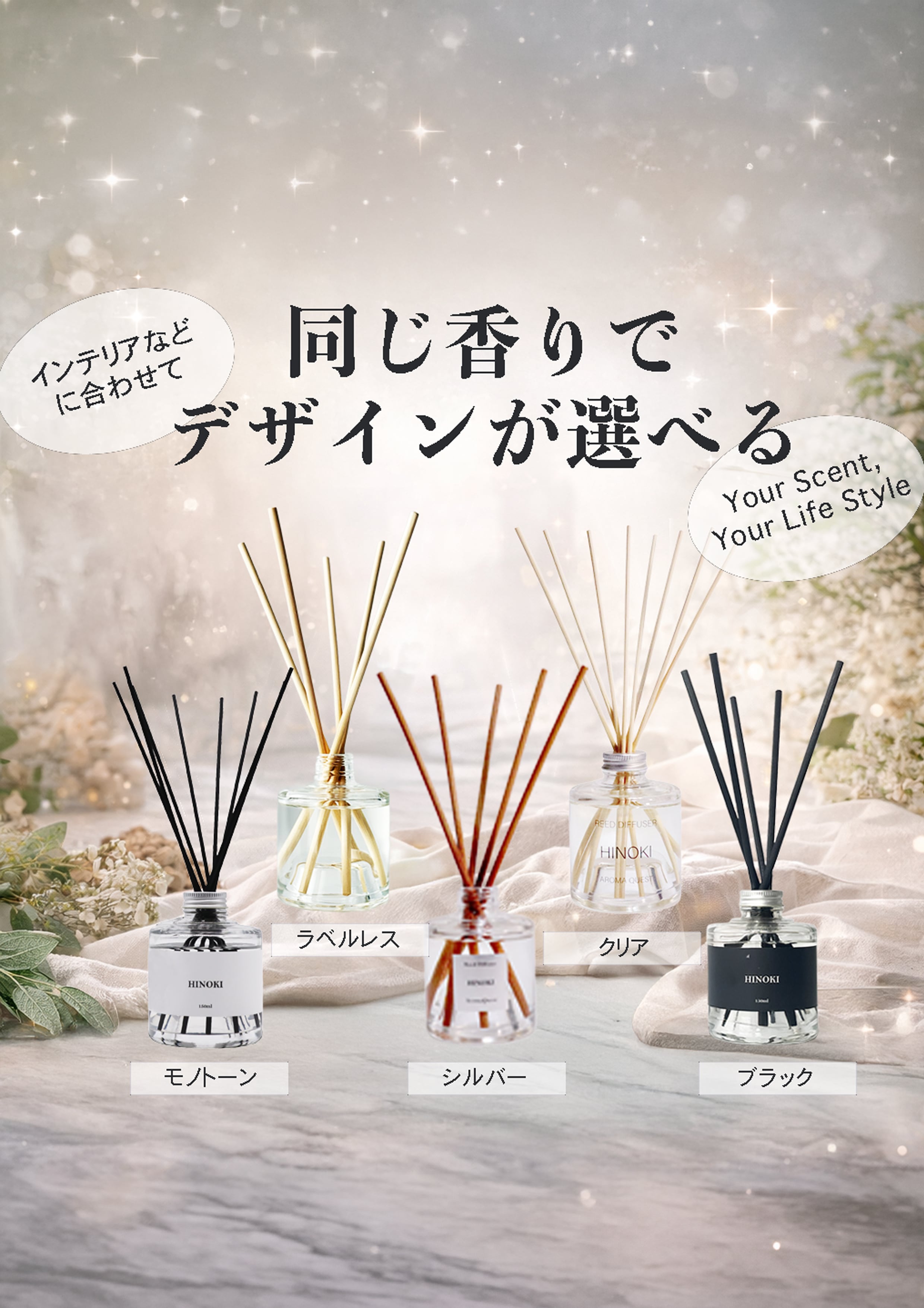 ◾️ホテルの香りも手掛ける業務用メーカーのオリジナルブランド ◾️香り・タイプ・デザインをライフスタイルに合わせて選択 ◾️感性で空間を上質に演出するリードディフューザー <ヒノキの香り/本体(化粧箱入り)/モノトーン> 【デザイン】モノトーン ■シンプルなデザインが、香りを引き立て上品な雰囲気を演出します■上品なモノトーンカラーはインテリアとも相性がよく、優雅で清潔感がありラグジュアリーな雰囲気がつくれます 【香り】ヒノキの香り ■ヒノキの落ち着いたウッドフレグランスの香り■吉野ひのき、青森ひばを基調とした、爽やかで厳かな落ち着きのある自然な香り■和の空間の演出や木目調の家具・インテリアなどに合わせてもお勧めです 【パッケージ】光沢白箱入り ■高級感のある専用ボックス入り ・容量:150ml ・成分:香料、溶剤、吉野ひのき精油、青森ひば精油、ユーカリ精油 ■同梱品 ・コースター、チャーム、説明書(チャック付きビニール袋) ・ファイバースティック8本 (ブラック、 3mm x 25cm)(OPP袋入り)*コースター、チャームの仕様は予告なく変更される場合がありますのでご了承ください ◆◆◆アロマクエスト リードディフューザーシリーズ◆◆◆ ■ホテルの香りも手掛ける業務用フレグランスメーカーのオリジナルブランド ●香り・タイプ・デザインをライフスタイルに合わせて選択。 感性で選ぶ、上質な空間 【香り】 ■ヒノキ ・アールグレイティー ・レモングラス ・ローズマリーレモン ・ユーカリハーブ ・ラベンダーオレンジ ・シトラスサボン ・フローラルソープ ・オリエンタルソープ ・シルキーエレガンス ・グリーンハーブ ・オレンジピール ・エレガントパルファム ・フルール・ローズ ・シトラスアップル 【タイプ】 ■用途に合わせて選べる仕様「桐箱入り」「化粧箱入り」「エコボックス(エコ包装)」「リフィル」 【デザイン】 ■インテリアに合わせて選べる 5つのデザイン 「モノトーン」「シルバー」「ブラック」「クリア」「ラベルレス」 ◾️ホテルの香りも手掛ける業務用メーカーのオリジナルブランド ◾️香り・タイプ・デザインをライフスタイルに合わせて選択 ◾️感性で空間を上質に演出するリードディフューザー <ヒノキの香り/本体(化粧箱)/モノトーン> 【デザイン】モノトーン ■スタイリッシュでシンプルなモノトーンデザインが、香りを引き立てる上品なインテリアを演出します。高級感あふれる化粧箱は、贈り物にも最適です。 【香り】ヒノキの香り ◼️深い森林の中にいるかのような、心地よいヒノキの香り。リラックスしたい時間にぴったりのフレグランスです。 【タイプ】本体(化粧箱) ■シンプルでエレガントな化粧箱に入っており、特別な日のためのプレゼントとしても喜ばれます。 ・容量:150ml ・成分:香料、溶剤 ■同梱品 ・コースター、チャーム、説明書(チャック付きビニール袋) ・ファイバースティック8本 (ブラック、 3mm x 25cm)(OPP袋入り)*コースター、チャームの仕様は予告なく変更される場合がありますのでご了承ください ◆◆◆アロマクエスト リードディフューザーシリーズ◆◆◆ ■ホテルの香りも手掛ける業務用フレグランスメーカーのオリジナルブランド ●香り・タイプ・デザインをライフスタイルに合わせて選択。感性で選ぶ、上質な空間 【香り】 ■ヒノキ ・アールグレイティー ・レモングラス ・ローズマリーレモン ・ユーカリハーブ ・ラベンダーオレンジ ・シトラスサボン ・フローラルソープ ・オリエンタルソープ ・シルキーエレガンス ・グリーンハーブ ・オレンジピール ・エレガントパルファム ・フルール・ローズ ・シトラスアップル 【タイプ】 ■用途に合わせて選べる仕様「桐箱入り」「化粧箱入り」「エコボックス(エコ包装)」「リフィル」 【デザイン】 ■インテリアに合わせて選べる 5つのデザイン 「モノトーン」「シルバー」「ブラック」「クリア」「ラベルレス」