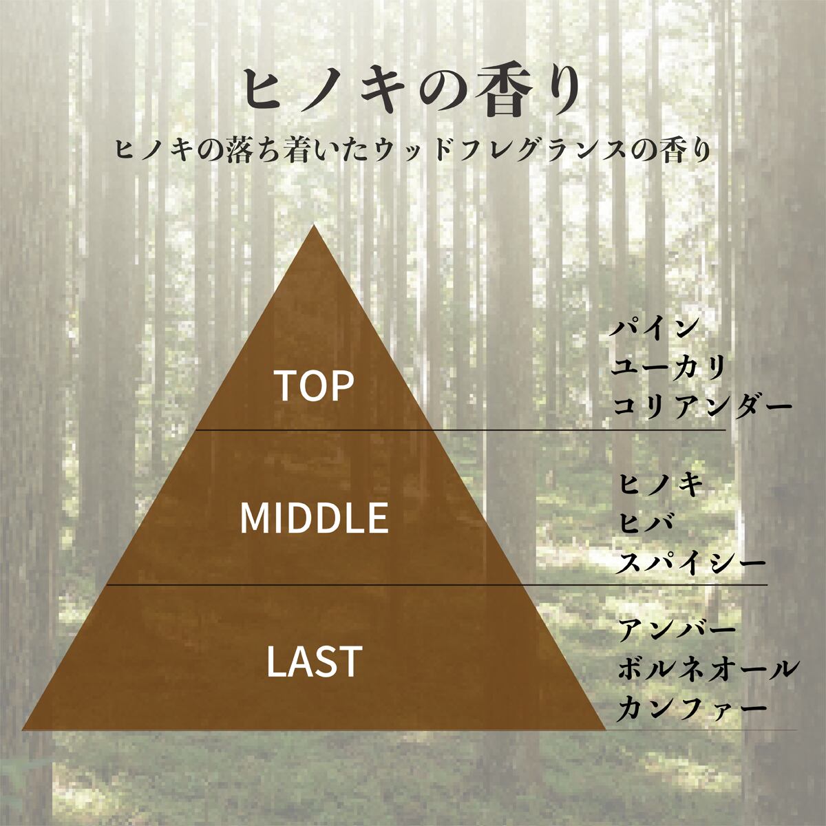 ■ヒノキの落ち着いたウッドフレグランスの香り■吉野ひのき、青森ひばを基調とした、爽やかで厳かな落ち着きのある自然な香り■和の空間の演出や木目調の家具・インテリアなどに合わせてもお勧めです