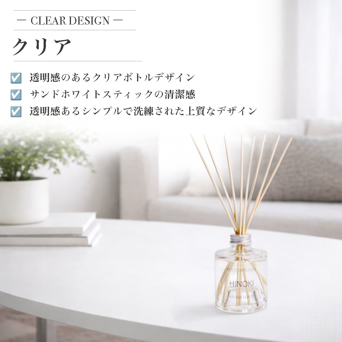 クリアなボトルラベルとサンドホワイトのスティックが調和し、穏やかで清らかな空気感を生み出します。