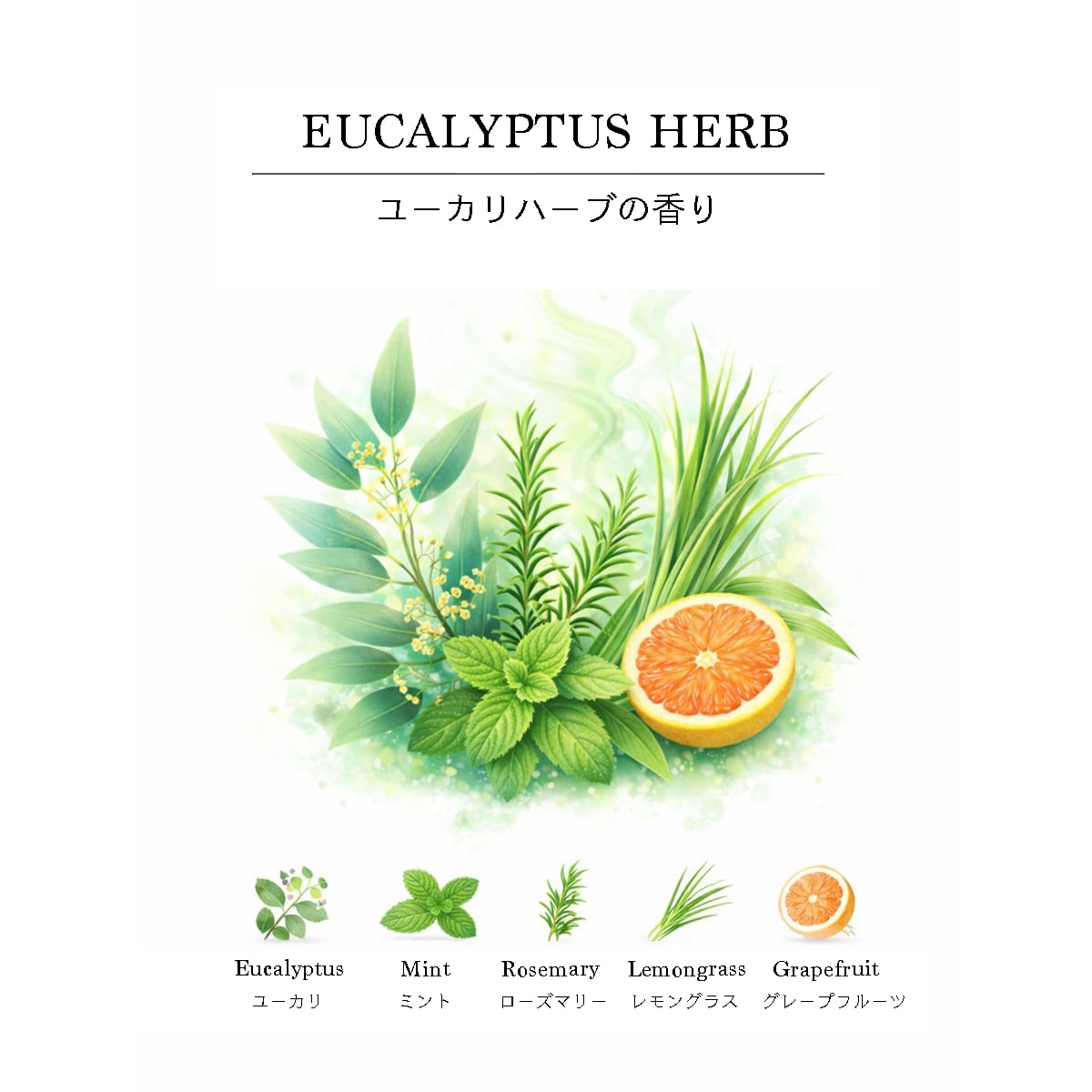 精油のグレープフルーツ、ペパーミント(和種薄荷)、ユーカリプタス、レモングラス、ローズマリーを使用した涼しげで爽やかなハーブの香りです。
