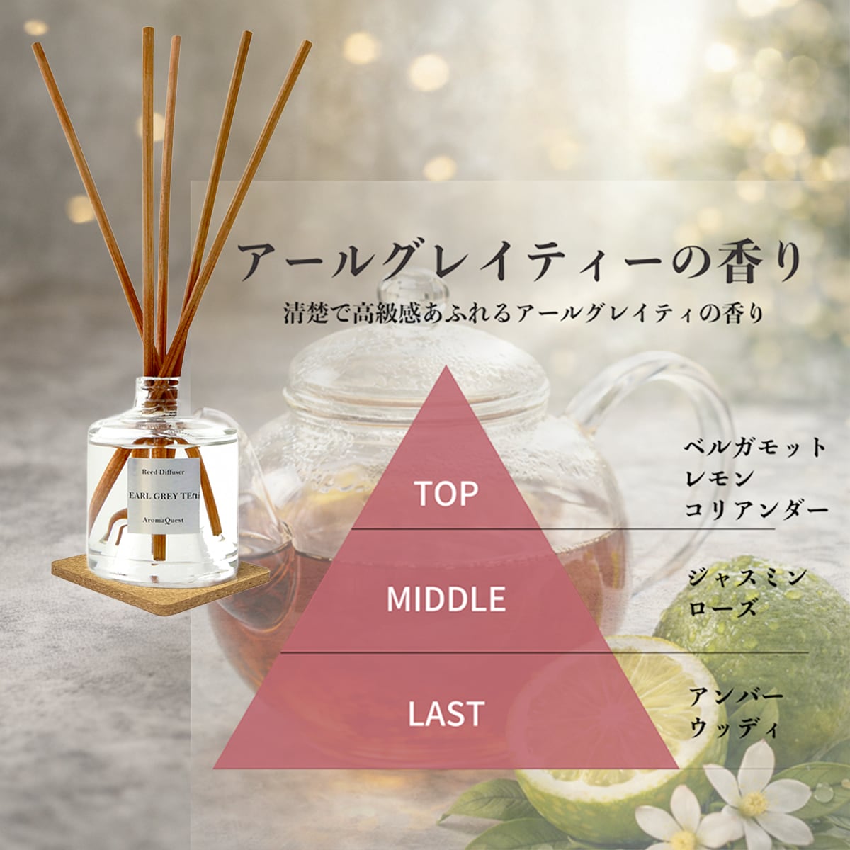 インテリア性の高いリードディフューザーにぴったりの香りです。
